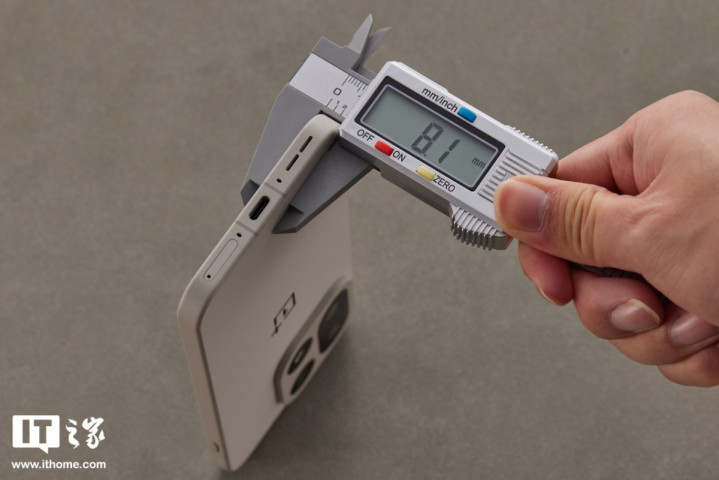 尺寸方面,IT之家实测机身厚度约8.1mm(出厂自带保护膜状态),官方尺寸规格为161.4*76.7*8.18mm(原色沙丘配色),机身重量约211g。